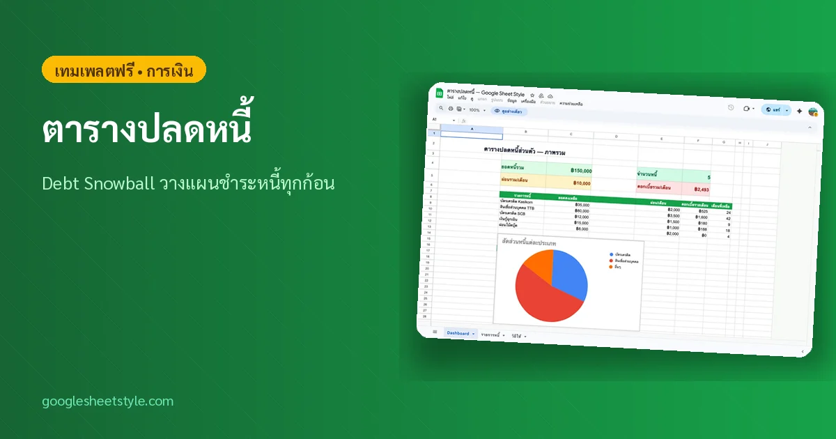 เทมเพลตตารางปลดหนี้บน Google Sheets นี้ช่วยให้เห็นภาพรวมหนี้ทุกก้อนในหน้าเดียวมีสูตรคำนวณดอกเบี้ยรายเดือน เดือนที่เหลือ และ Dashboard สรุปสัดส่วนหนี้แต่ละประเภท